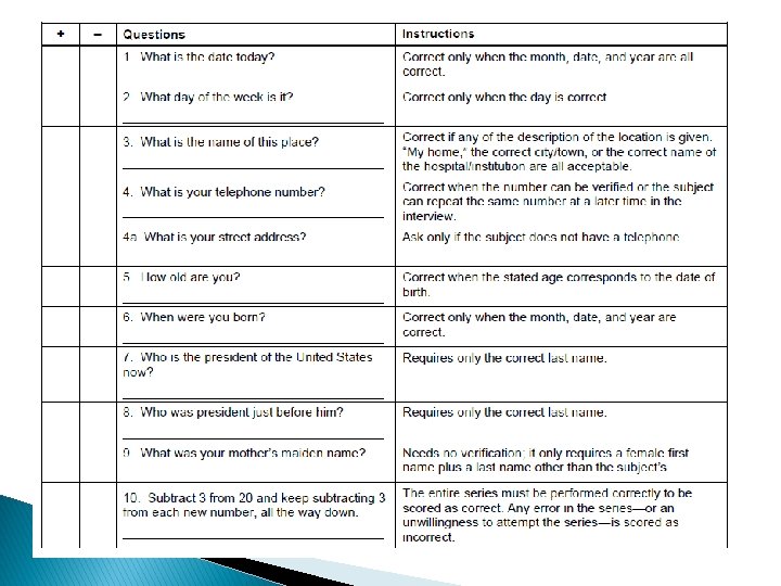 Short Portable Mental Status Questionnaire (SPMSQ) � 10 Items � Maximum Score: 10 ◦ ◦ 0 -2 errors 3 -4 errors 5 -7 errors 8 -10 errors � 5 -10 Intact Mild impairment Moderate impairment Severe impairment minutes to administer