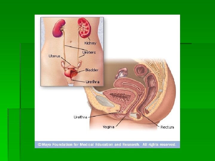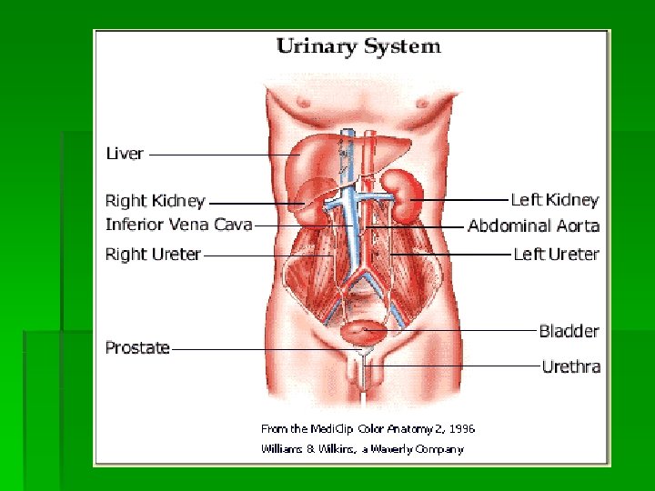 TERMINOLOGY § § § Micturation—Urination Frequency—Frequent voiding >every 3 hours Urgency—Strong desire to void Hesitancy—Delay or difficulty in initiating voiding Nocturia—Excessive urination at night Oliguria—Output <400 m. L/day Anuria—Output <50 m. L/day Polyuria—Increased volume of urine voided Hematuria—RBCs in urine Dysuria—Painful or difficult voiding Enuresis—Involuntary voiding during sleep Incontinence—Involuntary loss of urine