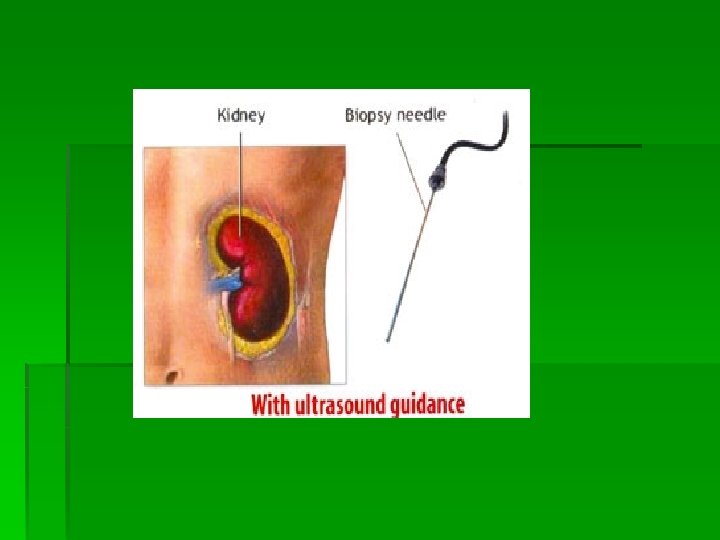 Renal Biopsy § § Percutaneous kidney biopsy Clotting studies Preprocedure care Follow-up care § Assessment for bleeding for 24 hours § Strict bedrest § Monitoring for hematuria § Comfort measures
