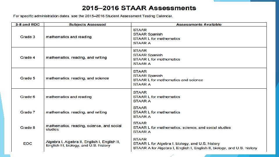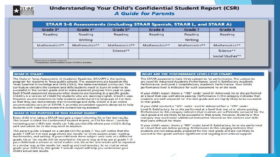 What is STAAR? The State of Texas Assessments of Academic Readiness (STAAR®) is the testing program for students in Texas public schools. The assessments are based on the Texas Essential Knowledge and Skills (TEKS), the state-mandated curriculum. The curriculum contains the content and skills students need to learn in order to be successful in the current grade and to make academic progress from year to year. Each STAAR assessment measures what students are learning in a specific grade. STAAR L is a version of STAAR for students who are learning English. STAAR L uses linguistic accommodations to help students understand the language of the tests so that they can demonstrate their knowledge and skills. STAAR A is an online accommodated version of STAAR. It provides embedded supports designed to help students with disabilities access the content being assessed. School Improvement, Accountability and Compliance