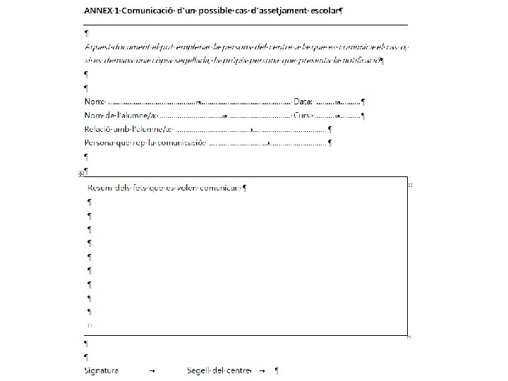 2. Alguns referents expliquen el que els han contat com si ells fossin l’alumne (família) – “. . . Hola. Som en/na. . . . (el nom de l’alumne/a assetjat/da) i en aquests moments/fa uns dies/darrerament. . . . (explica breument el que li està passant); aquesta situació fa que em senti. . . . (explica com es sent); per sentir-me millor, necessitaria que. . . . . (intenta concretar què li fa falta que passi)”