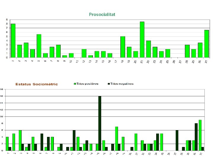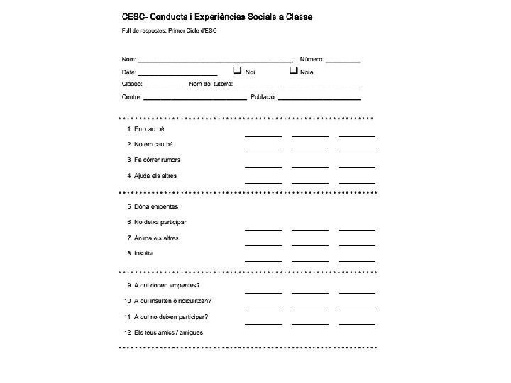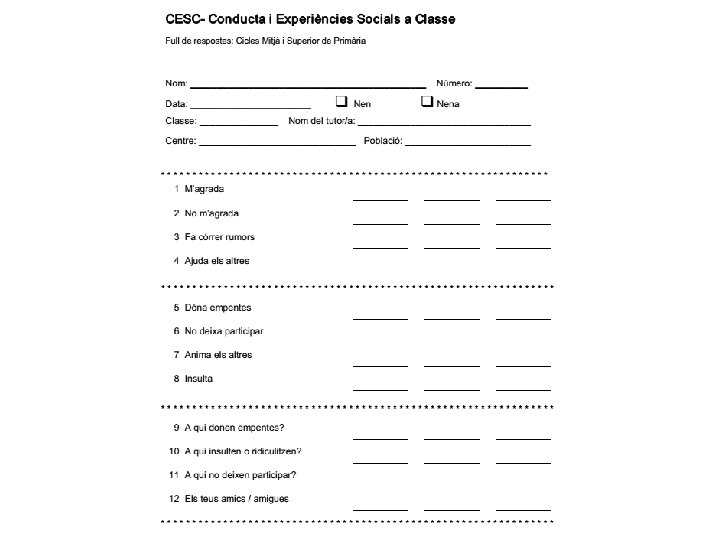 • Representació gràfica de les relacions afectives dins el grup • Hi ha centres que l’inclouen al Pla d’Acció Tutorial • El CESC (Conductes i Experiències Socials a Classe) inclou preguntes sobre: – Amistat / rebuig – Agressivitat / victimització – Prosocialitat • Versions: – Paper i llapis – Moodle