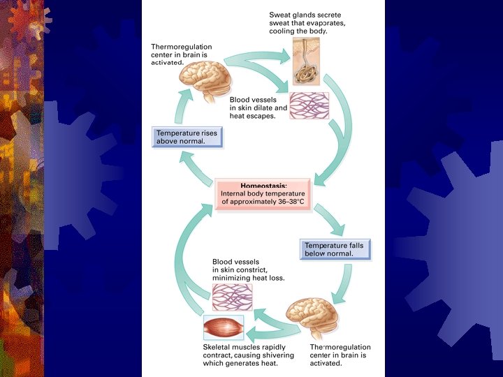 b. Exercise creates metabolic heat which raises the body temperature (the stimulus), cooling mechanisms such as vasodilation (flushed skin) and sweating begin (the response), body temperature falls (thus decreasing the original stimulus).