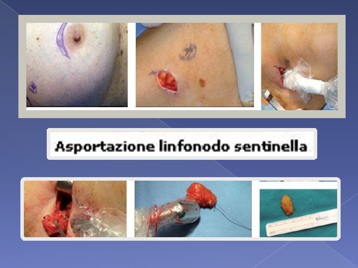 Il tracciante per via linfatica raggiunge e si fissa alla prima stazione drenante: il linfonodo sentinella. In camera operatoria il chirurgo, utilizzando una sonda per la chirurgia radioguidata, gamma probe, individua il punto dove il segnale maggiore ed in questa sede viene ricercato ed asportato il linfonodo sentinella. Il patologo procede all'esame istologico del linfonodo esaminando numerose sezioni seriate - ogni 50 / 100 micron - così da individuare non solo metastasi massive ma anche la presenza di micrometastasi o di cellule tumorali isolate. .
