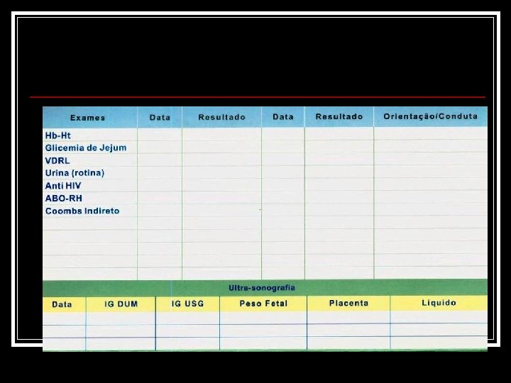 Exames de Rotina: Na 1º consulta devem ser solicitados os seguintes exames: n Tipagem sangüínea e fator RH; n Sorologia para Lues(VDRL); n Eas e urinocultura; n Hematócrito e hemoglobina; n Exame direto da secreção vaginal e citopatológico cervical; n Glicemia de jejum; n Anti-HIV;