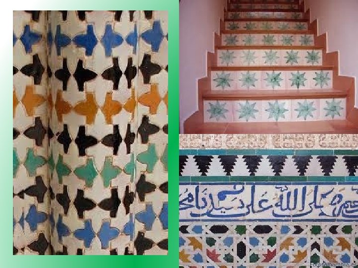 Les ornements géométriques et végétaux sont arrivés à l'époque nasride. Les couleurs dominantes sont le vert (depuis le VIIIe s. ), le marron (depuis le XIIIe s. ) et le bleu (depuis le XVIe s. ). À noter que l'apparence de l'actuelle céramique populaire de Grenade, qui reprend toutes le techniques antérieures, date du XVIIIe s. Multitude d'objets sont confectionnés, tels des plateaux, des coupes, des carafes à eau, des répicients pour l'huile, des services à café, etc. . .