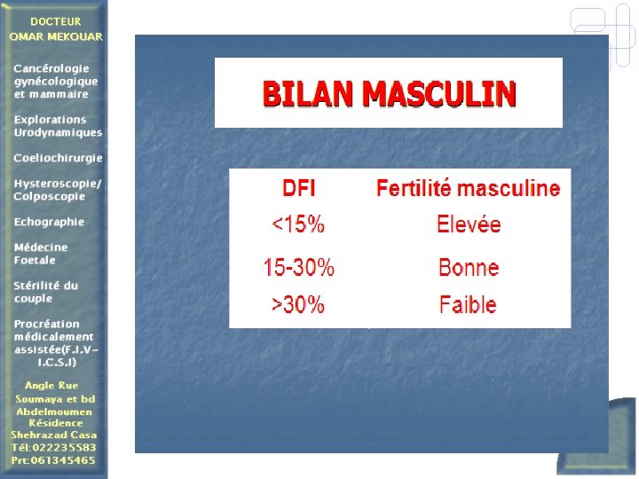 Association Marocaine des Échographistes ARRET DU TABAC TEST DE FRAGMENTATION DE L’ ADN : DFI >30°/° anti-oxydants pendant 3 mois et contrôle du spermogramme et DFI PUIS FIV-ICSI si TMS <1 million