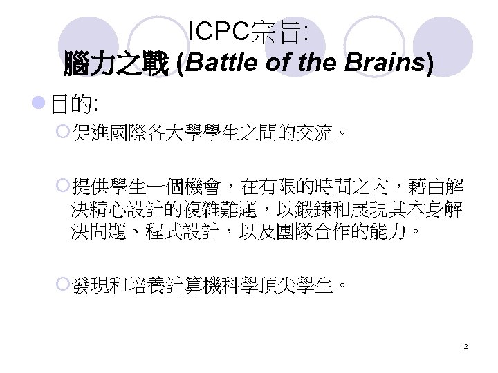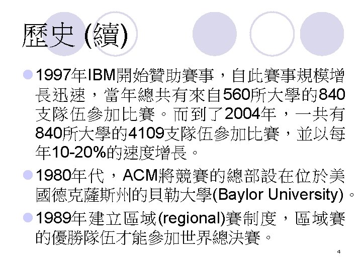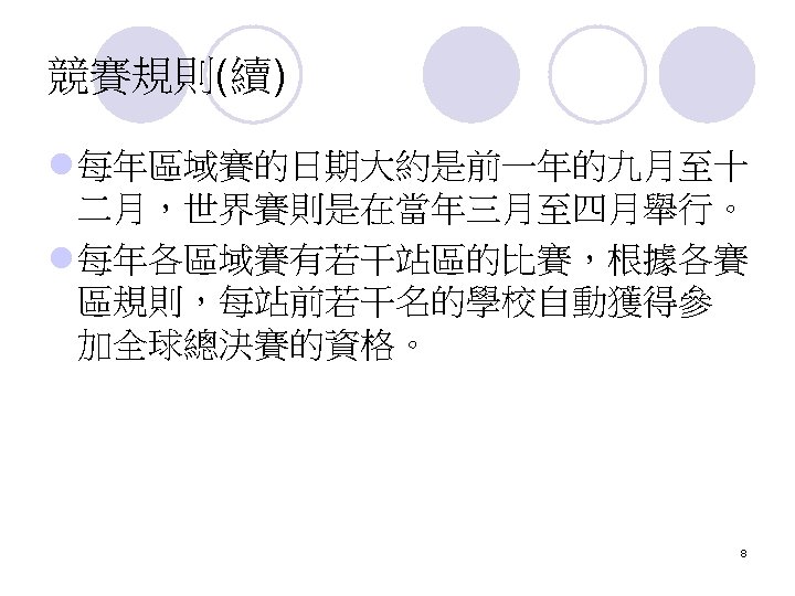 競賽規則 l ICPC 共分兩個階段: ¡區域賽 (Regional Contest) ¡世界賽 (World Final) l 6個區域賽區 ¡北美 (North America) ¡南美 (Latin America) ¡歐洲 (Europe) ¡非洲 (Africa) ¡亞洲 (Asia) ¡南太平洋 (South Pacific) 7