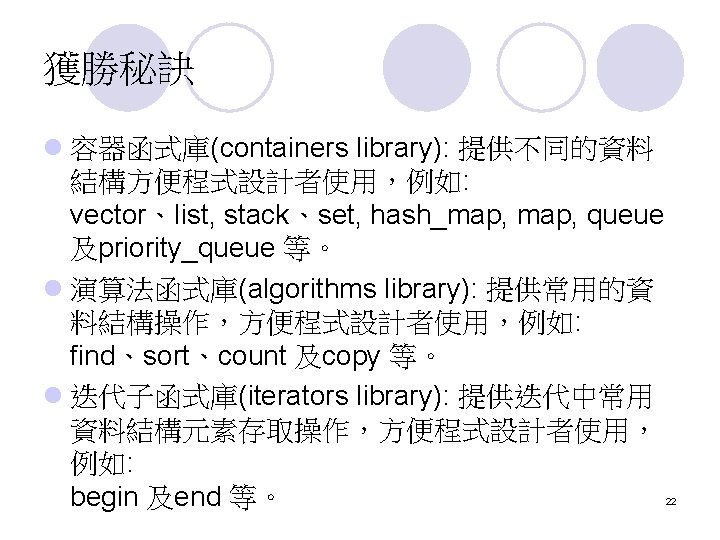 獲勝秘訣 l 熟悉比賽使用之作業系統: ¡ 2014 World Final使用的作業系統為Fedora Core 4 Linux , 桌面為GNOME,編輯器為vi/vim、gvim、emacs、gedit l 熟悉比賽使用之語言版本: ¡ 2014 World Final使用的語言為 Java: Version 1. 7. 0_25; Open. JDK Runtime Environment (Iced. Tea 2. 3. 10 -- 7 u 25 -2. 3. 10 -1 ubuntu 0. 12. 04. 2, Open. JDK 64 -Bit Server VM (build 23. 7 -b 01, mixed mode ¡ C/C++: GCC 4. 6. 3 (Ubuntu/Linaro 4. 6. 3 -1 ubuntu 5) 18
