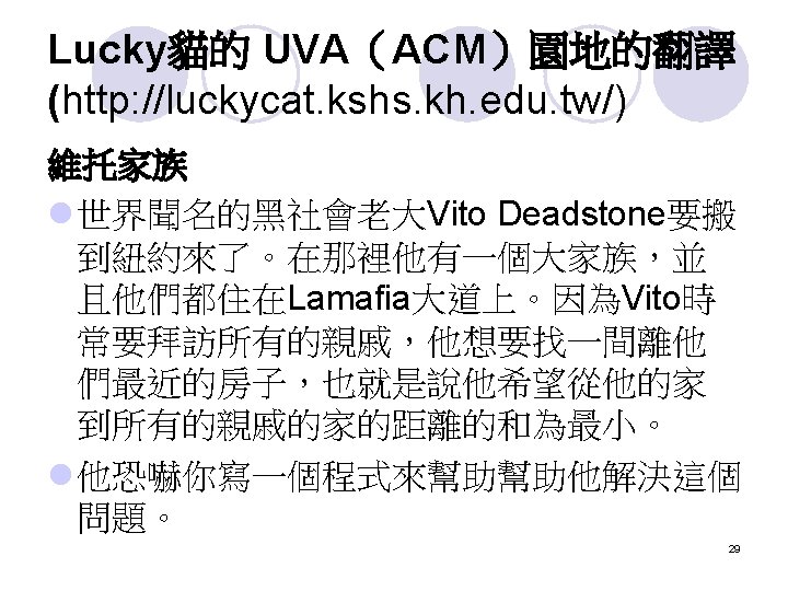 題目: l. Background l The world-known gangster Vito Deadstone is moving to New York.