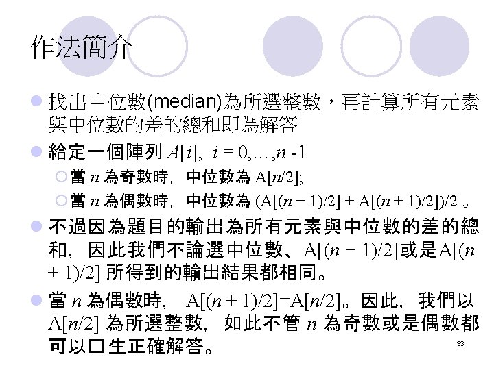 題目: l. Background l The world-known gangster Vito Deadstone is moving to New York. He has a very big family there, all of them living in Lamafia Avenue. Since he will visit all his relatives very often, he is trying to find a house close to them. l. Problem l Vito wants to minimize the total distance to all of them and has blackmailed you to write a program that solves his problem. 26