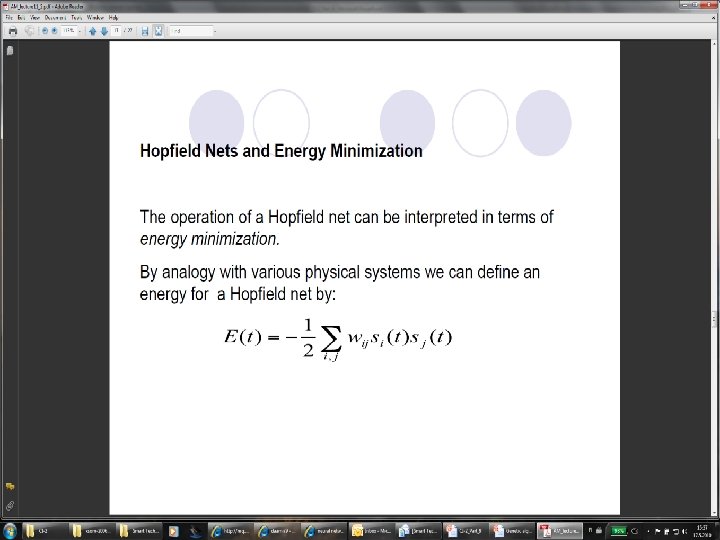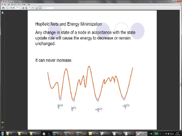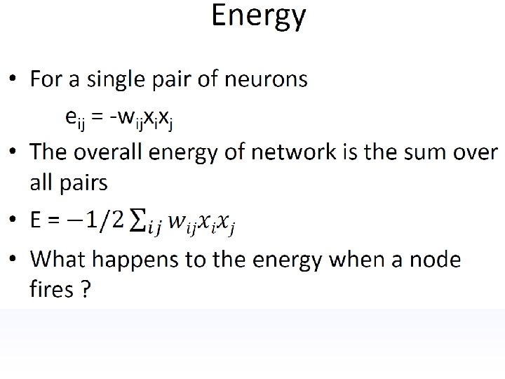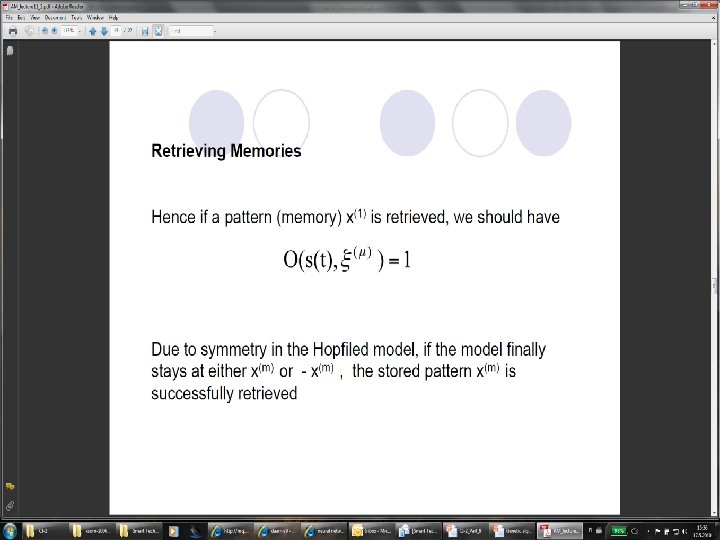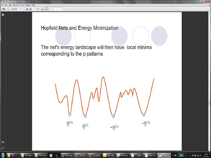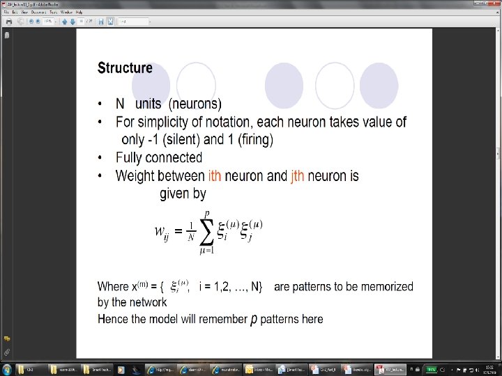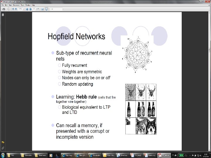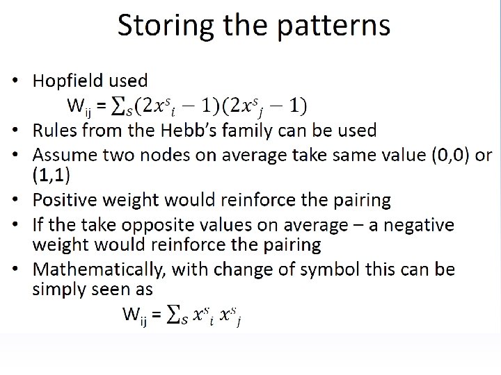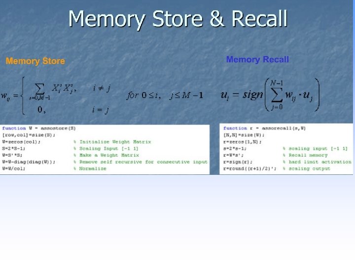 Modeling Memory • Two important points – Stores a set patterns and recalls the one closest to initial position – Minimum energy state is reached • Properties of network – Described by state vectors – Has a set of stable states – Network evolves to reach stable state closest to initial state resulting in decrease of energy notes from http: //www. cs. ucla. edu/~rosen/