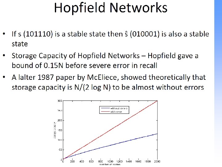 Storage Capacity of Hopfield Networks Capacity = Relationship between # patterns that can be stored & retrieved without error to the size of the network. Capacity = # patterns / # nodes or # patterns / # weights • If we use the following definition of 100% correct retrieval: When any of the stored patterns is entered completely (no noise), then that same pattern is returned by the network; i. e. The pattern is a stable attractor. • A detailed proof shows that a Hopfield network of N nodes can achieve 100% correct retrieval on P patterns if: P < N/(4*ln(N)) In general, as more patterns are added to a network, the avg correlations will be less likely to match the correlations in any particular pattern. Hence, the likelihood of retrieval error will increase. => The key to perfect recall is selective ignorance!! N Max P 10 1 100 5 1000 36 10000 271 1011 109