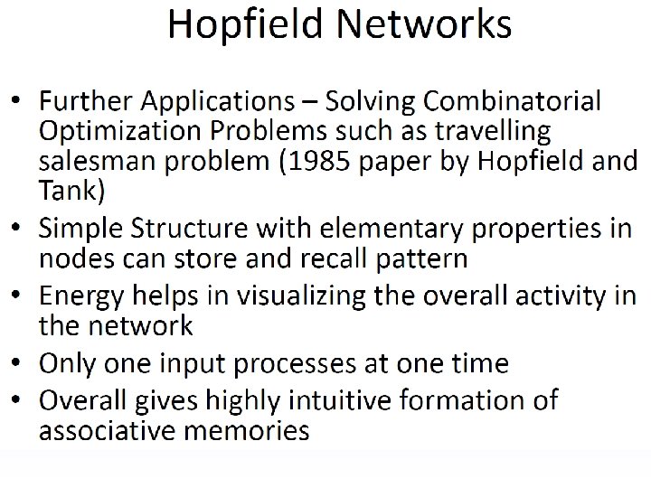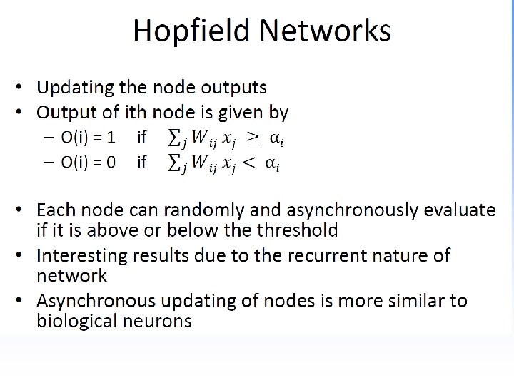 Hopfield Networks • A recurrent neural network which can function as a associative memory • A node is connected to all other nodes (except with itself) • Each node behaves as an input as well as output node • Network’s current state defined by outputs of nodes