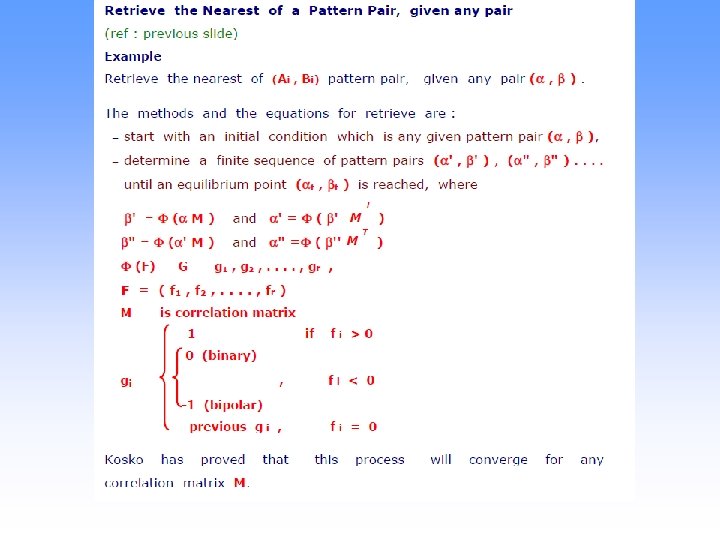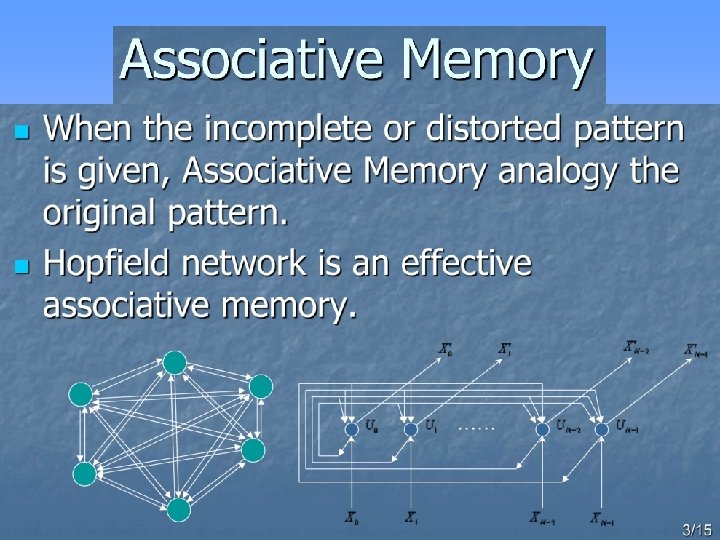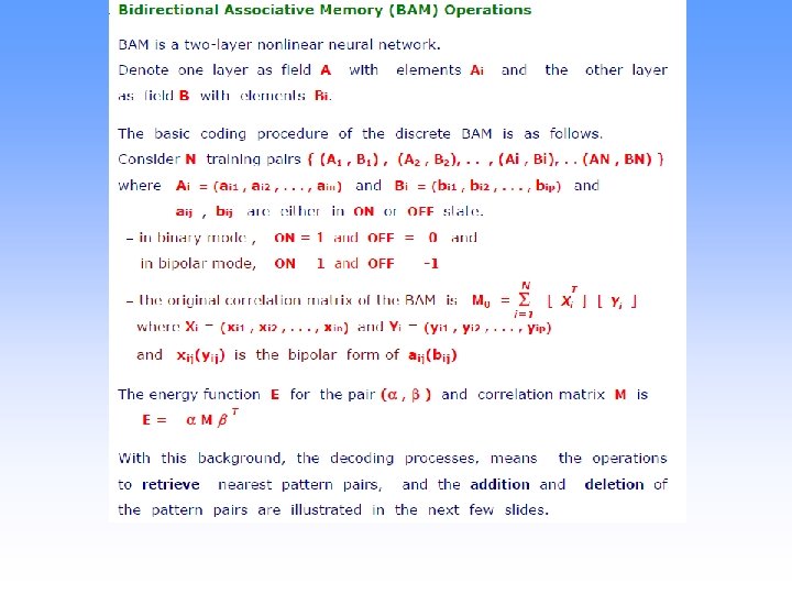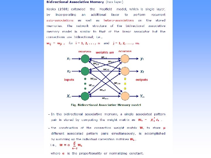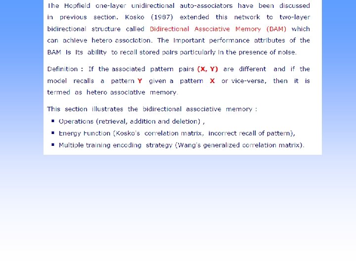 Associative Network Types 1. Auto-associative: X = Y *Recognize noisy versions of a pattern 2. Hetero-associative Bidirectional: X <> Y BAM = Bidirectional Associative Memory *Iterative correction of input and output