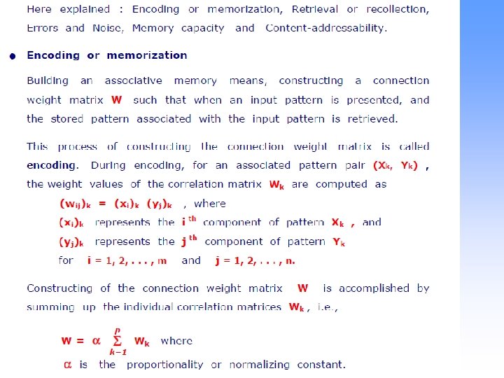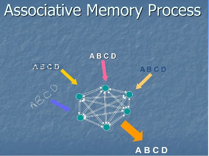 Associative Memory • “Remembering” ? – Associating something with sensory cues • Cues in terms of text, picture or anything • Modeling the process of memorization • The minimum requirements of a content addressable memory