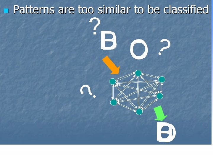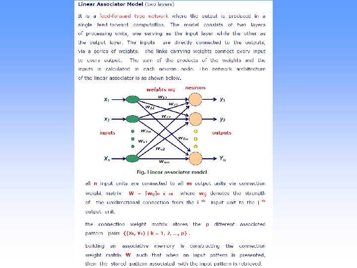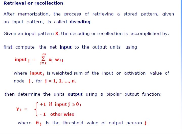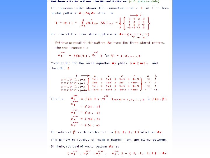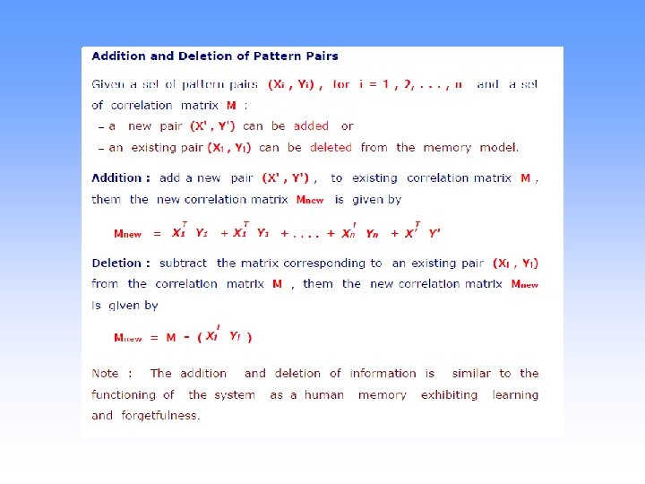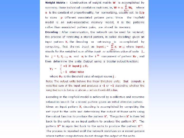 Matrix Representation Let X = matrix of input patterns, where each ROW is a pattern. So xk, i = the ith bit of the kth pattern. Let Y = matrix of output patterns, where each ROW is a pattern. So yk, j = the jth bit of the kth pattern. Then, avg correlation between input bit i and output bit j across all patterns is: 1/P (x 1, iy 1, j + x 2, iy 2, j + … + xp, iyp, j) = wi, j To calculate all weights: Hetero Assoc: W = XTY Auto Assoc: W = X TX XT X P 1 P 2 : In Pattern p: x 1, 1. . x 1, n Y Pp Out P 1: y 1, 1. . y 1, j……y 1, n In Pattern 1: x 1, 1. . x 1, n In Pattern 2: x 2, 1. . x 2, n Dot product X 1, i X 2, i . . Xp, i Out P 2: y 2, 1. . y 2, j……y 2, n : Out P 3: yp, 1. . yp, j ……yp, n