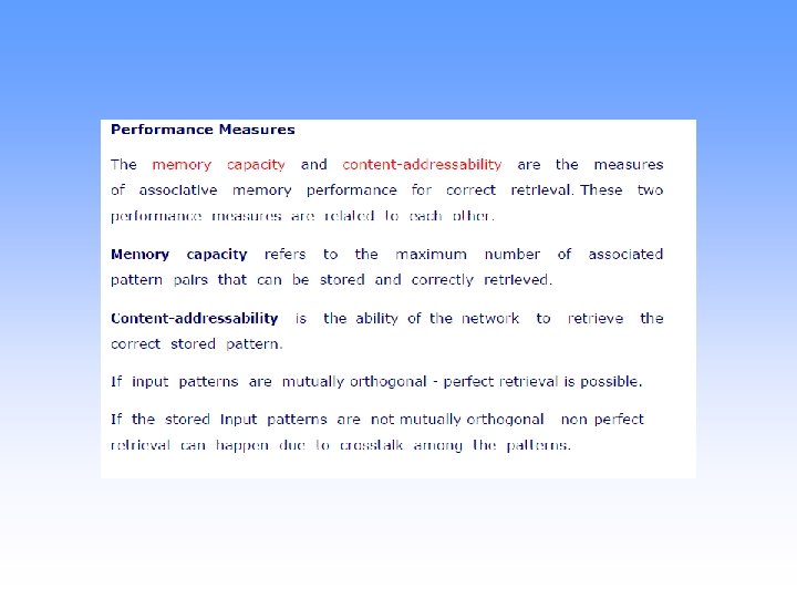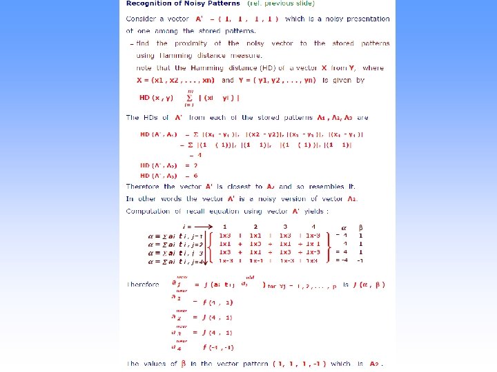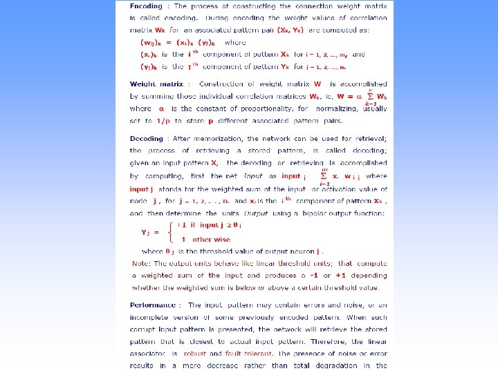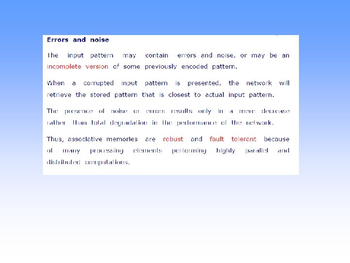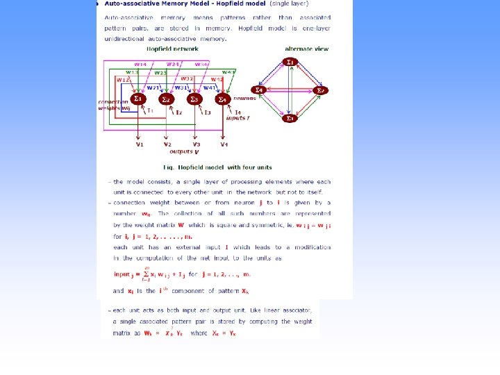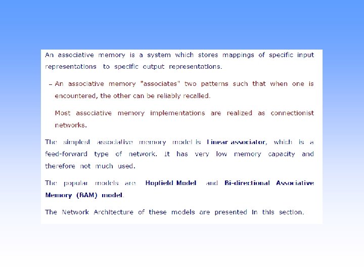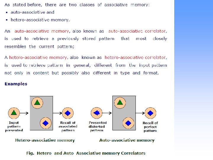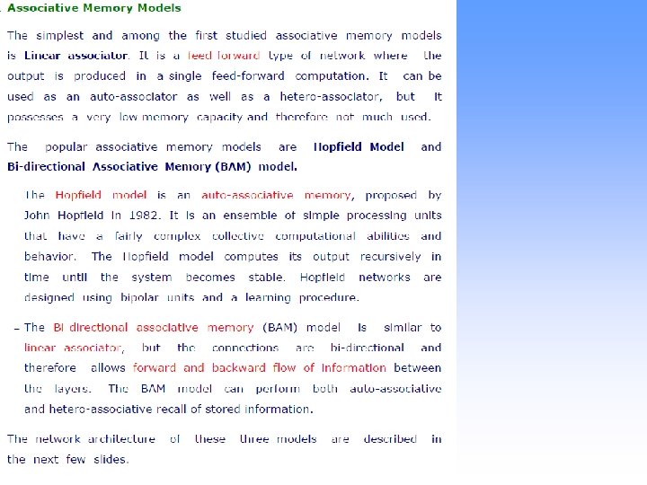 Associative Memory • Able to store multiple independent patterns • Able to recall patterns with reasonable accuracy • Should be able to recall partial or noisy input patterns • Other expectations – Speed and biological similarities