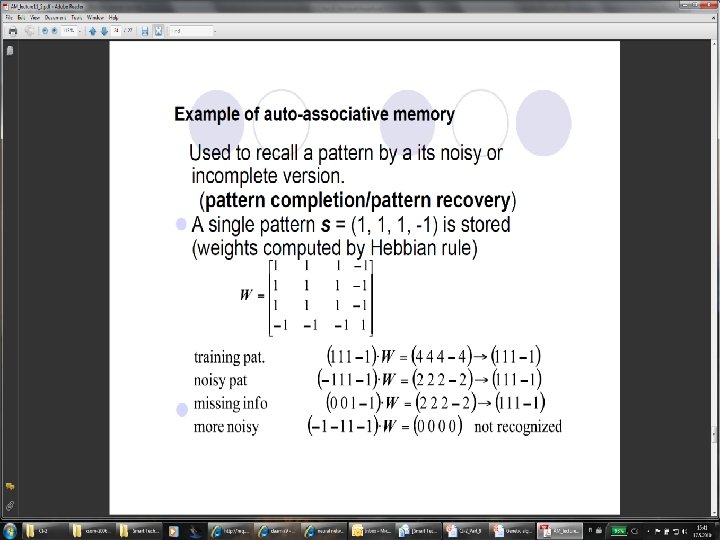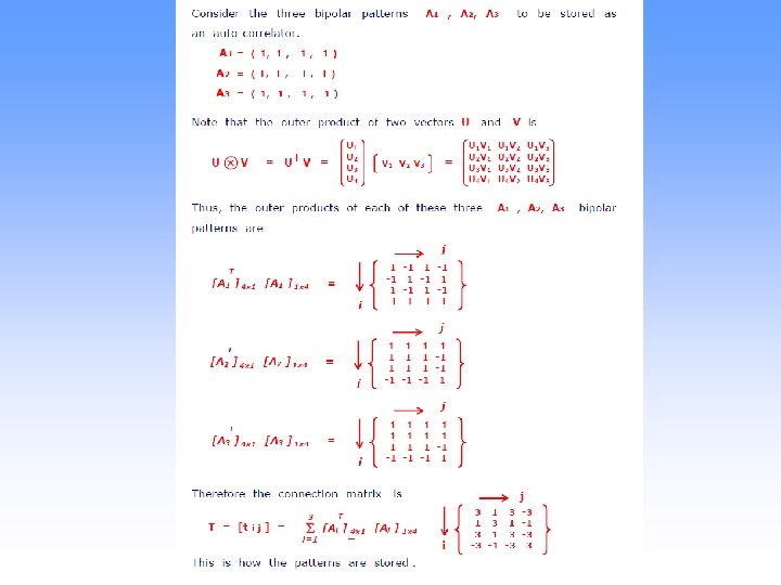 Using Matrices Goal: Set weights such that an input vector Vi, yields itself when multiplied by the weights, W. X = V 1, V 2. . Vp, where p = # input vectors (i. e. , patterns) So Y=X, and the Hebbian weight calculation is: W = XTY = XTX 1 1 -1 1 1 1 X= 1 1 -1 1 XT = 1 -1 1 1 -1 -1 3 1 -1 1 XTX = 1 3 1 -1 -1 1 3 -3 1 -1 -3 3 Common index = pattern #, so this is correlation sum. w 2, 4 = w 4, 2 = x. T 2, 1 x 1, 4 + x. T 2, 2 x 2, 4 + x. T 2, 3 x 3, 4
