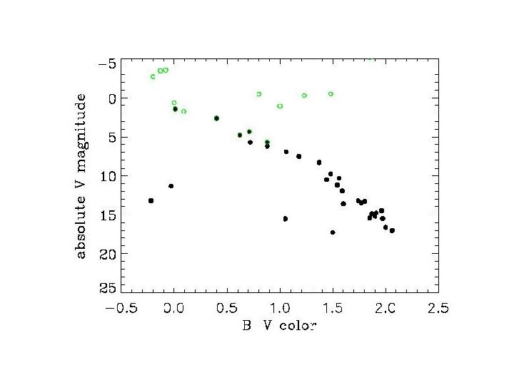 The Hertzsprung. Russell Diagram • X-axis: color, temp, spectral type • Y axis: absolute magnitude, luminosity Reveals giants, dwarfs, and the main sequence (distances from parallax)
