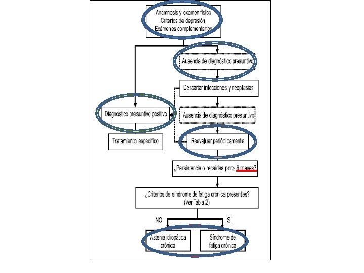Síndrome de Fatiga Crónica. • ¿Fibromialgia es uno de los diagnósticos diferenciales? – Ambos procesos pueden ser sincrónicos en un 20 a 70% de los pacientes. – ¿Corresponden a un mismo cuadro?