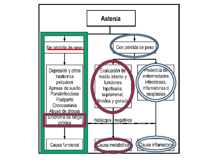 Astenia • Presente en múltiples patologías crónicas sistémicas: – Anemia, cáncer, metabólicas y patología adrenal y neurológica. • Puede limitarse a ciertos órganos o sistemas: – Astenopia (fatiga de la visión) – M G: fatigabilidad progresiva muscular.