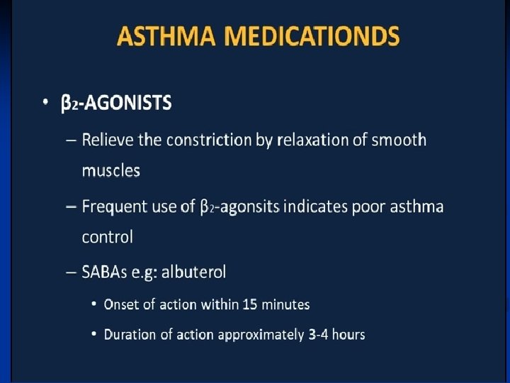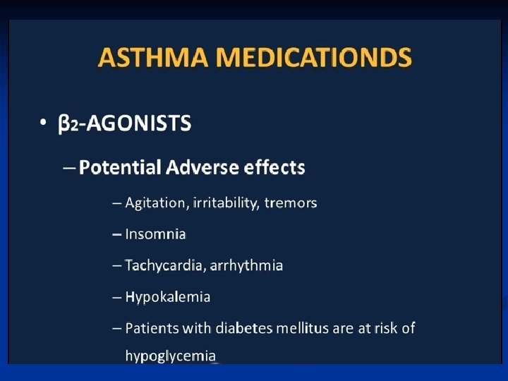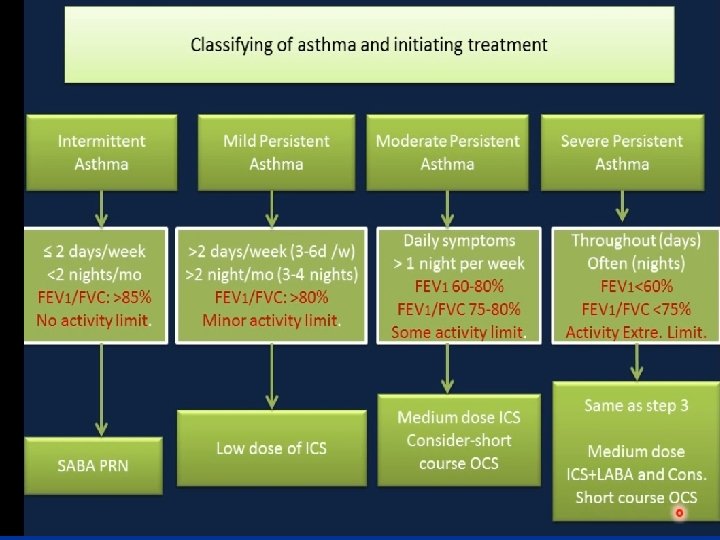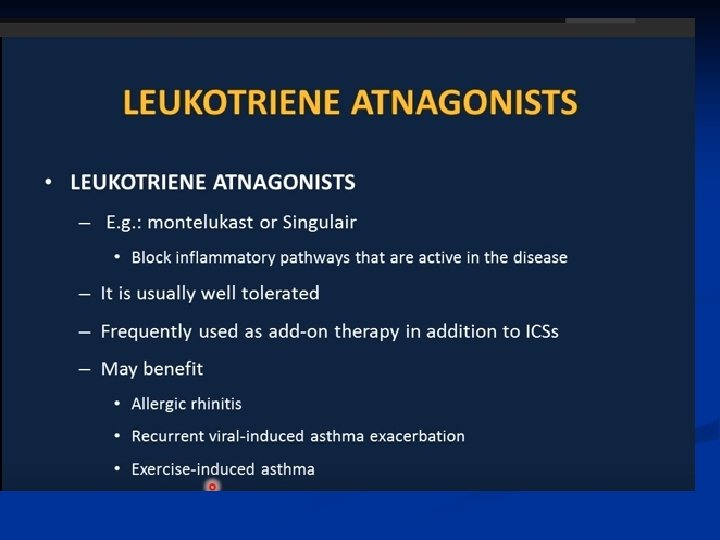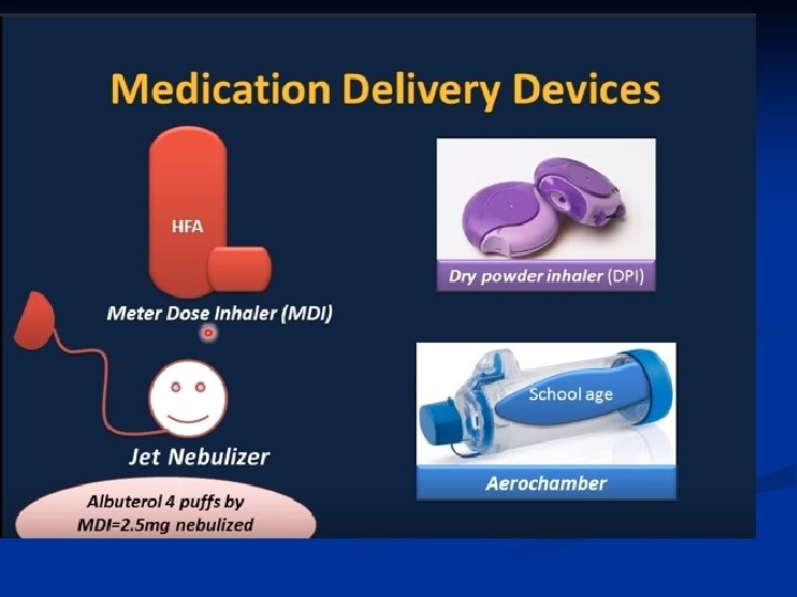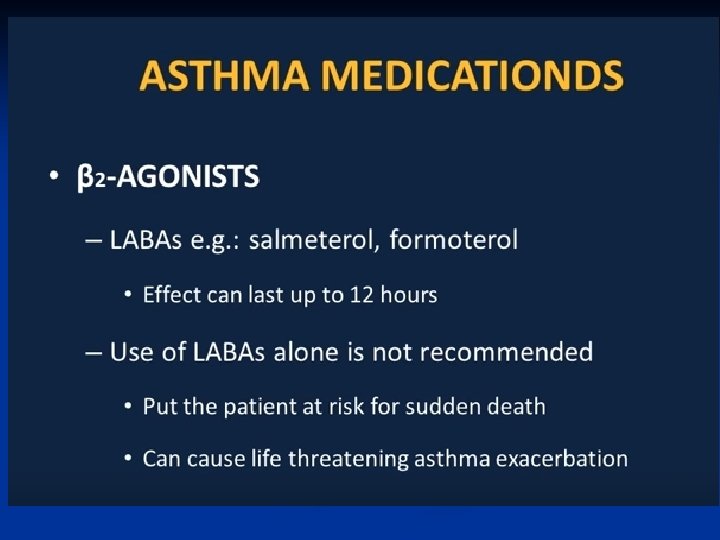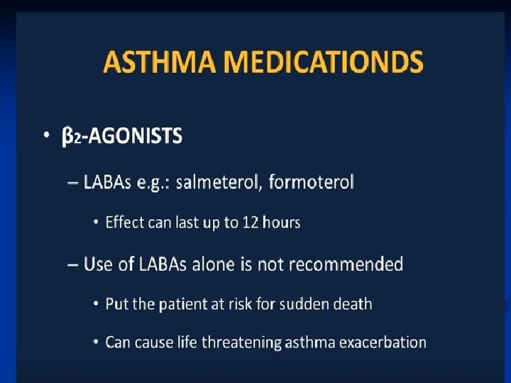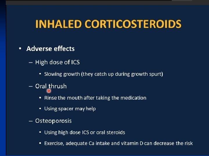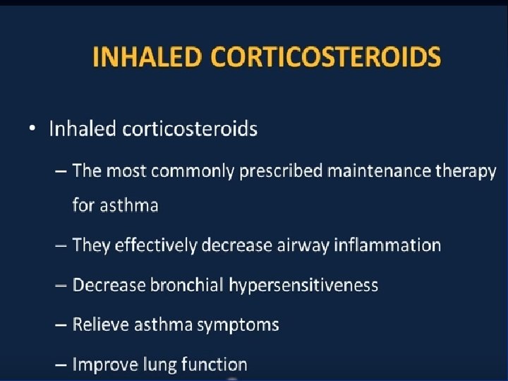Treatment—Inhaled Steroids ■ Inhaled corticosteroids are standard of care for all categories except for mild intermittent asthma • Long term prevention of symptoms; suppression, control and reversal of inflammation. • Block late reaction to allergen • Reduce airway hyperresponsiveness • Inhibit inflammatory cell migration and activation • Increase B 2 receptor affinity