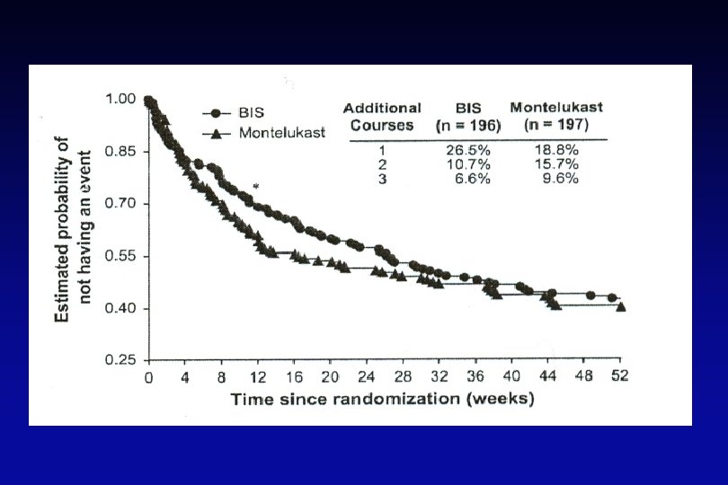 Severity of Symptoms During Acute Episodes Proportion with an Episode Day Montelukast Budesonide Mean Conventional Therapy AUC Montelukast Budesonide Conventional Therapy 5. 3 6. 0 P=0. 35 Day Trouble Breathing Score Montelukast Budesonide Conventional Therapy Mean AUC P-value vs. Conventional Therapy Montelukast Budesonide Conventional Therapy 4. 1 3. 9 6. 4 0. 008 0. 004 -- Ref. Bacharier and CARE Network, JACI 2008; 122: 1127 -35 Day