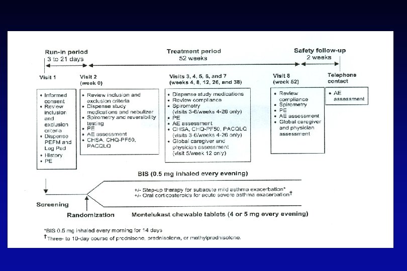 MIST Design Run-in 2 weeks Randomization Cohort: ages 12 -53 mo, recurrent wheezing, + API and severe episode prior yr Arm A Maintenance daily therapy* Intermittent therapy with each Respiratory Tract Illness (RTI)‡ Low-dose ICS QD Pulmicort Respules® (0. 5 mg QD) Placebo ICS BID x 7 days Placebo ICS QD High-dose ICS BID x 7 days Pulmicort Respules® (1. 0 mg BID x 7 days) Arm B 52 weeks Randomized, DBPC parallel multicenter trial comparing maintenance low-dose ICS vs intermittent high-dose ICS x 7 days with every RTI on rate of exacerbations requiring systemic corticosteroids. * Maintenance therapy continued during every respiratory tract illness ‡ Conventional episodic therapy: albuterol qid x 2 days, then prn and, if indicated, oral steroid rescue