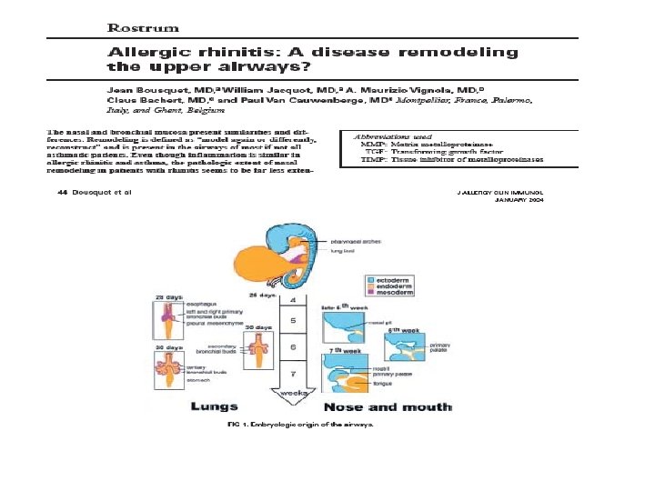 Astım ve Rinit İlişkisi Anatomik benzerlik ve farklılık Üst ve alt hava yolları embriyolojik gelişimi kronolojik benzer Gestasyonun 4. haftada Burun: nazal plaka ve çıkıntıdan Larenks , trakea, bronşlar ve akciğer : Primitif farenks ventral larengotrakeal oluktan