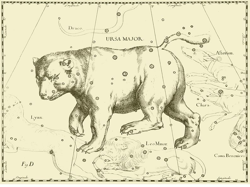 Constellations are largely arbitrary Other cultures, other constellations: Example: Ursa Major = bear, dipper, bull's leg, grain scoop, wagon, plow, etc. Stars in a constellation usually are not at the same distance from us. At a different place in our Galaxy, we would see different star patterns.