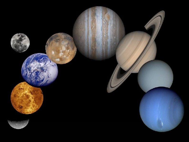 1) 2) 3) 4) 5) 6) 7) 8) 9) Object Sun Jupiter Saturn Neptune Uranus Earth Venus Mars Mercury Mass 330, 000 320 95 17 15 1. 0 0. 82 0. 11 0. 055 Object Mass 10) Ganymede 11) Titan 12) Callisto 13) Io 14) Moon 15) Europa 16) Triton 17) Pluto 0. 025 0. 023 0. 018 0. 015 0. 012 0. 008 0. 004 0. 002
