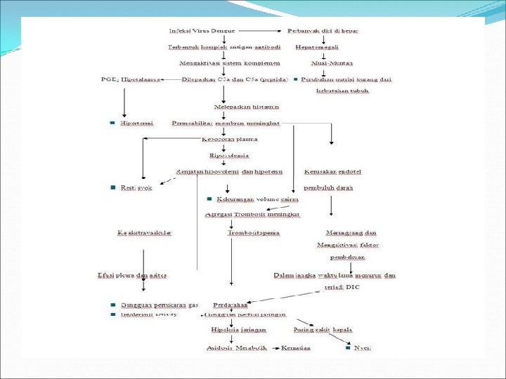 D. PATOFISIOLOGI Virus akan masuk ke dalam tubuh melalui gigitan nyamuk aedes aegypty dan kemudian akan bereaksi dengan antibody dan terbentuklah kompleks virus-antibody. Dalam sirkulasi akan mengaktivasi system komplemen. Akibat aktivasi C 3 dan C 5 akan dilepas C 3 a dan C 5 a, dua peptida yang berdaya untuk melepaskan histamine dan merupakan mediator kuat sebagai factor meningkatnya permeabilitas dinding pembuluh darah dan menghilangkan plasma melalui endotel dinding itu. Terjadinya trombositopenia, menurunnya fungsi trombosit dan menurunnya faktor koagulasi (protombin dan fibrinogen) merupakan factor penyebab terjadinya perdarahan hebat , terutama perdarahan saluran gastrointestinal pada DHF. Yang menentukan beratnya penyakit adalah meningkatnya permeabilitas dinding pembuluh darah , menurunnya volume plasma , terjadinya hipotensi , trombositopenia dan diathesis hemorrhagic , renjatan terjadi secara akut. Nilai hematokrit meningkat bersamaan dengan hilangnya plasma melalui endotel dinding pembuluh darah. Dan dengan hilangnya plasma klien mengalami hipovolemik. Apabila tidak diatasi bisa terjadi anoxia jaringan, acidosis metabolic dan kematian.