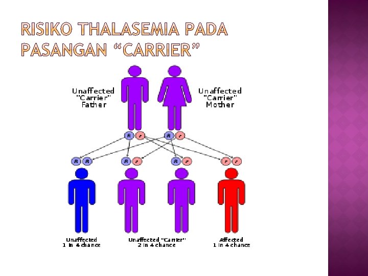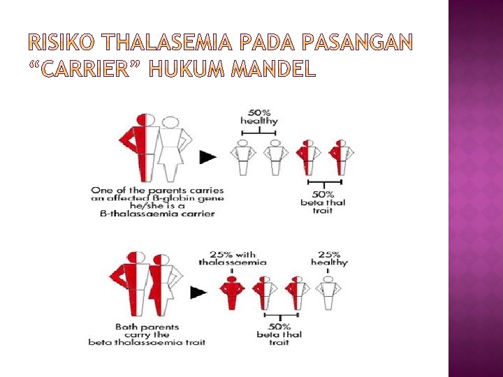 � Talasemia merupakan salah satu jenis anemia hemolitik dan merupakan heriditer yang diturunkan secara autosomal yang paling banyak dijumpai di Indonesia 6 – 10 dari setiap 100 orang Indonesia membawa gen penyakit ini. � Kalau pasangan carrier menikah, kemungkinan untuk mempunyai anak penderita talasemia berat adalah 25%, 50% menjadi pembawa sifat (carrier) talasemia, dan 25% kemungkinan bebas talasemia. � Sebagian besar penderita talasemia adalah anak usia 0 hingga 18 tahun.