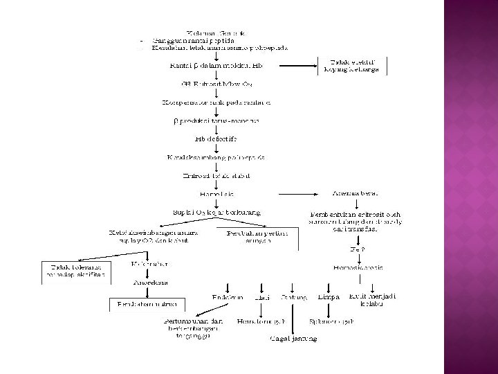 Normal hemoglobin adalah terdiri dari Hb-A dengan dua polipeptida rantai alpa dan dua rantai beta. � Pada Beta thalasemia yaitu tidak adanya atau kurangnya rantai Beta dalam molekul hemoglobin yang mana ada gangguan kemampuan eritrosit membawa oksigen. � Ada suatu kompensator yang meninghkatkan dalam rantai alpa, tetapi rantai Beta memproduksi secara terus menerus sehingga menghasilkan hemoglobin defektive. Ketidakseimbangan polipeptida ini memudahkan ketidakstabilan disintegrasi. Hal ini menyebabkan sel darah menjadi hemolisis dan menimbulkan anemia dan atau hemosiderosis. � �