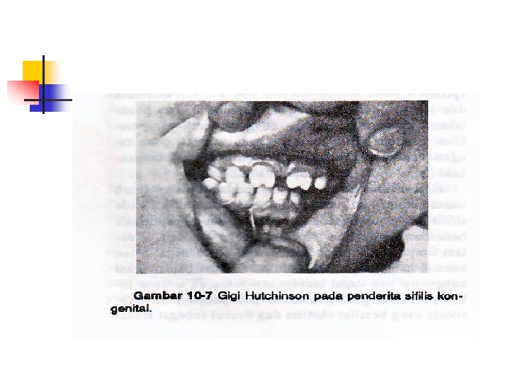 n Gigi : Terjadi gigi Hutchinson yaitu gigi lebih kecil, sisi gigi konveks, daerah untuk menggigit konkaf. Gigi molar pertama bawah : berbintil-bintil (tuberkula) mirip murbai disebut MURBERY MOLOAR, enamel tipis, mudah terjadi karies dan cepat tinggal.