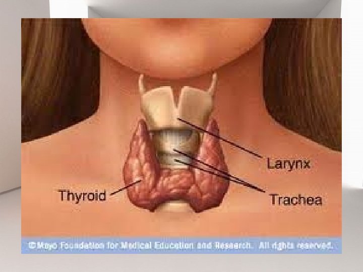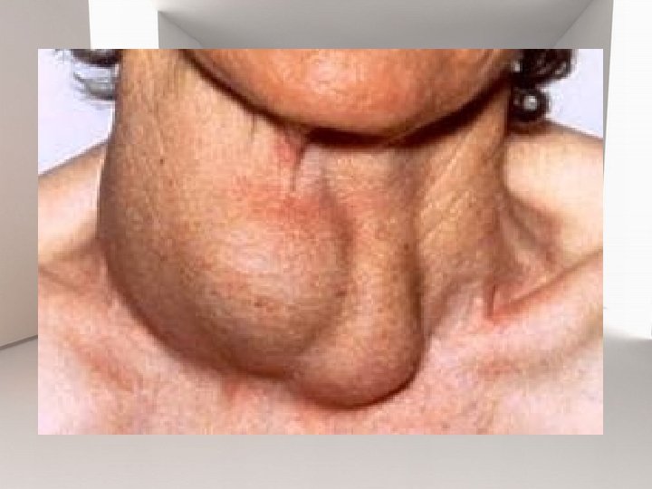 MANIFESTASI KLINIK v Tyroid membesar dengan lambat. v Awalnya kelenjar ini membesar secara difus dan permukaan licin. v. Jika struma cukup besar, akan menekan area trakea yang dapat mengakibatkan gangguan pada respirasi dan juga esofhagus tertekan sehingga terjadi gangguan menelan. v. Klien tidak ada keluhan krn tdk ada hipo atau hipertyroid
