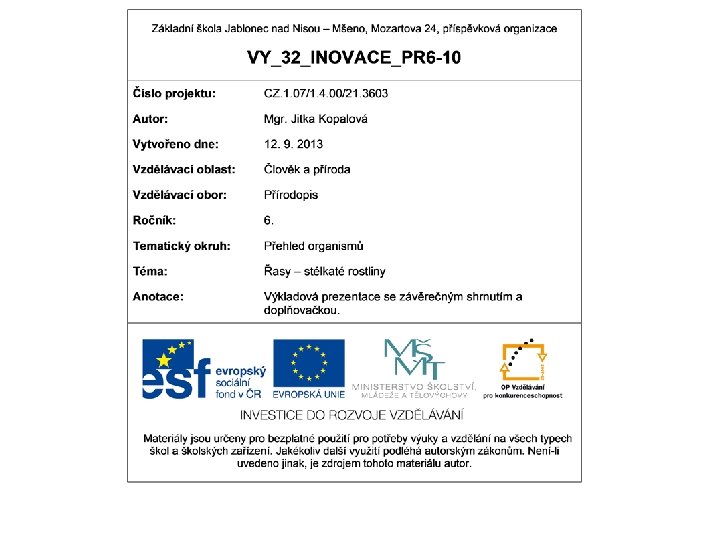 ZDROJE učebnice: ČABRADOVÁ, Věra. Přírodopis pro 6. ročník základní školy a primu víceletého gymnázia. 1. vyd. Plzeň: Fraus, 2003, 120 s. ISBN 80 -7238211 -X. obrázky: Wikipedie: šroubatka [online]. 2013 [cit. 201310 -13]. Dostupné z: http: //cs. wikipedia. org/wiki/Soubor: Spirogyra_sp. jpg Wikipedie: chaluha [online]. 2013 [cit. 2013 -10 -13]. Dostupné z: http: //cs. wikipedia. org/wiki/Soubor: Kelp_forest_Otago_1 s. JPG Wikipedie: červená řasa [online]. 2013 [cit. 2013 -10 -13]. Dostupné z: http: //cs. wikipedia. org/wiki/Soubor: Mastocarpus_stellatus. JPG