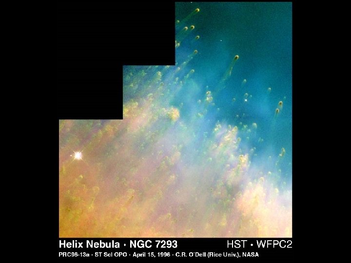 End Result • Once the entire outer shell has been expelled, a white dwarf remains. • The white dwarf ionizes the surrounding ejected matter, resulting in a planetary nebula. • The fossil AGB stellar wind can now be optically studied as spatial structures of gas and dust in the PN.