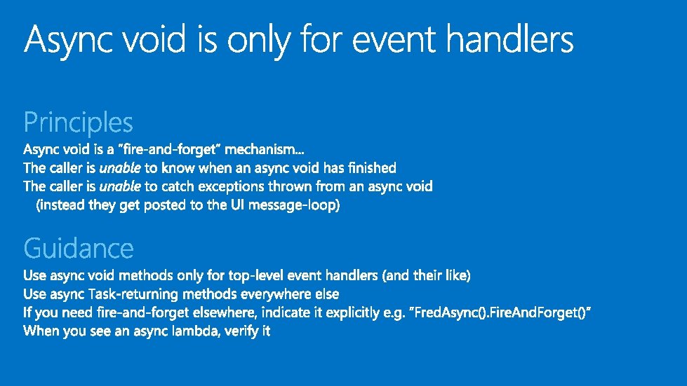 Async void is only for top-level event handlers. Use Task. Completion. Source to wrap Tasks around events. Use threadpool for CPU-bound code, but not IO-bound, Libraries shouldn't lie, should use Configure. Await, should be chunky.