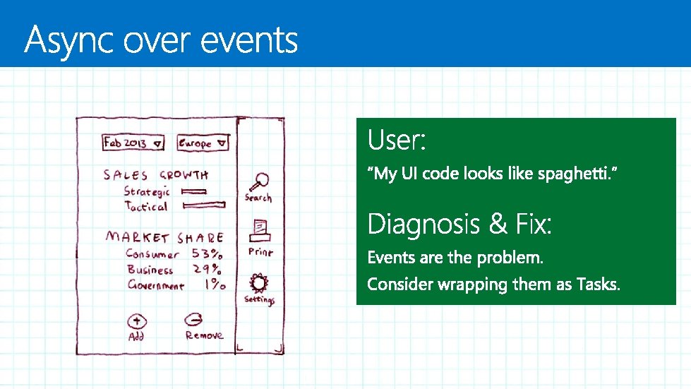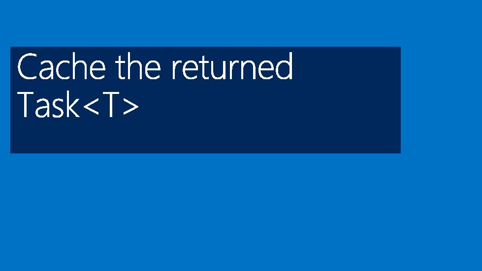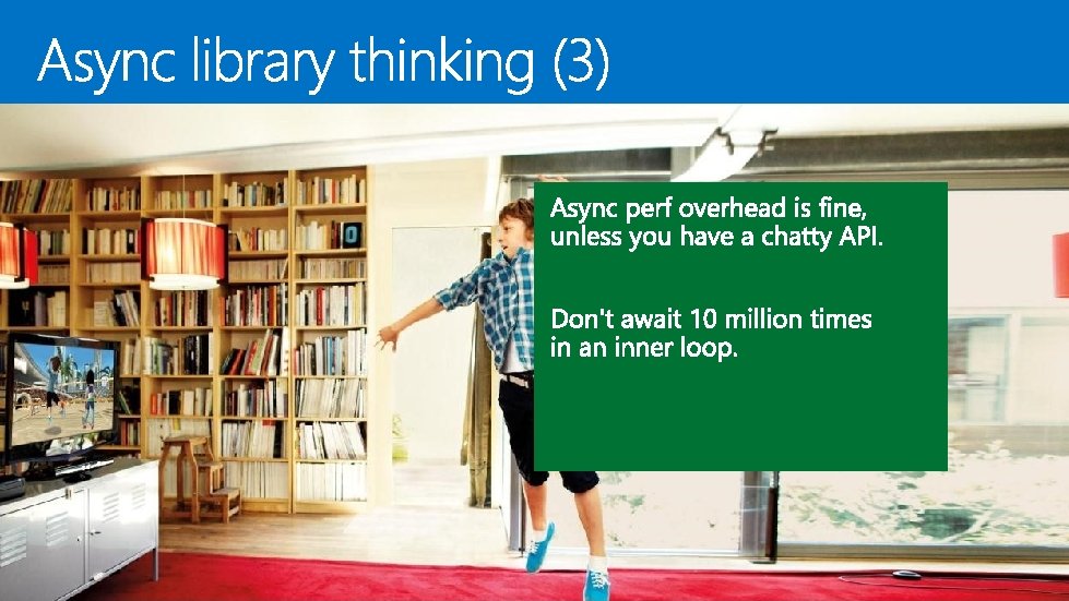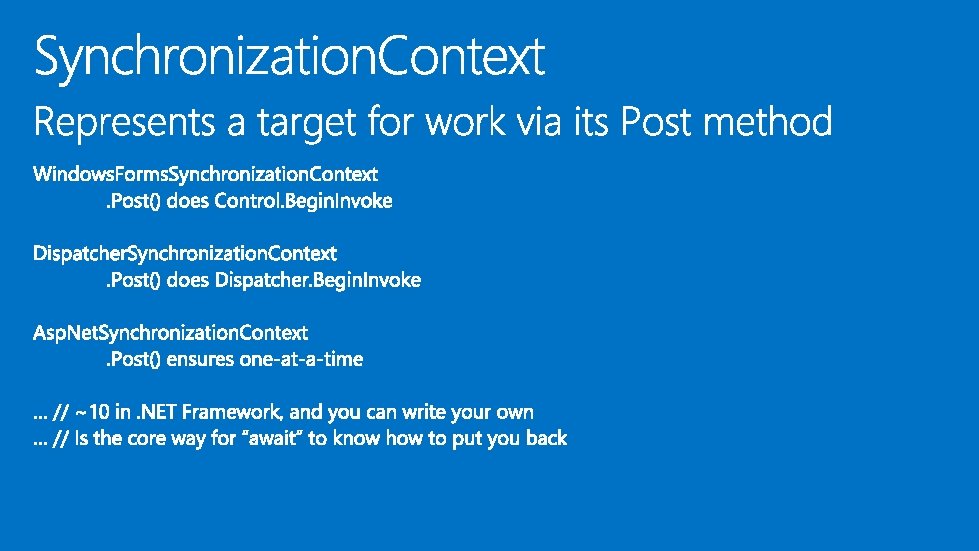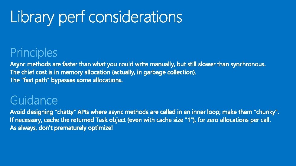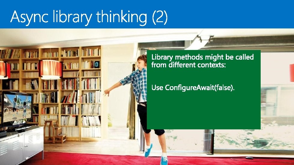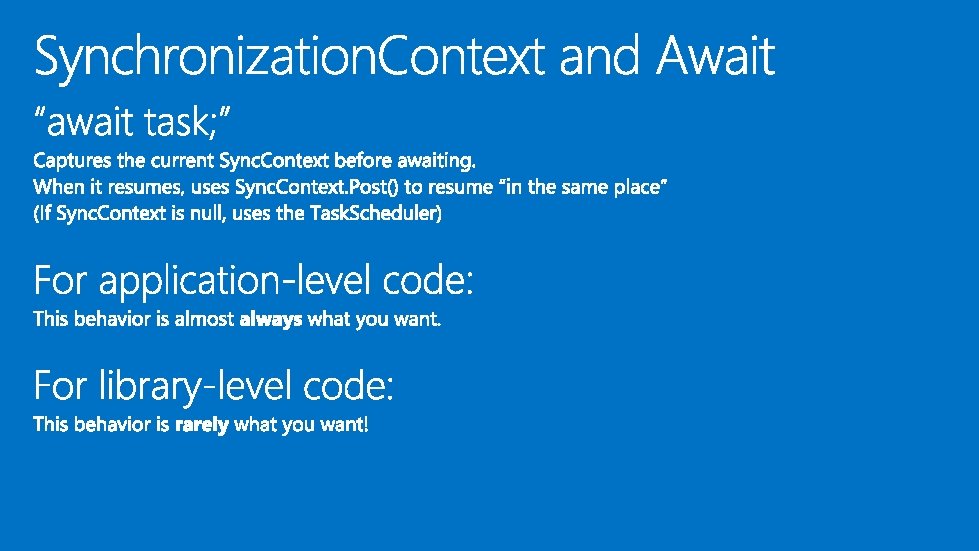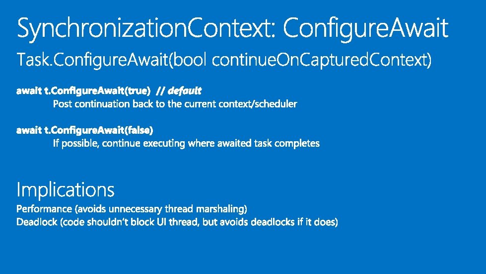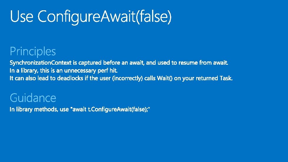 Use Configure. Await(false) User’s app Your library async void button 1_Click(…) { Do. Work. Async(). Wait(); await Do. Work. Async(); } async Task Do. Work. Async() { await Task. Run(. . . ). Configure. Await(false); Task. Run(. . . ); Console. Write. Line("Done task"); } Use Configure. Await(false) 2. Task. Run schedules work 3. Await captures 1. Do. Work. Async to run on thread pool Synchronization. Context and 4. UI blocks waiting for invoked on UI thread Do. Work. Async-returned hooks up a continuation to run when task completes Task to complete 6. UI thread still blocked waiting for async 5. Task. Run task completes on pool & invokes operation to complete. continuation which Posts back to UI thread Deadlock! . Configure. Await(false) avoids deadlock.