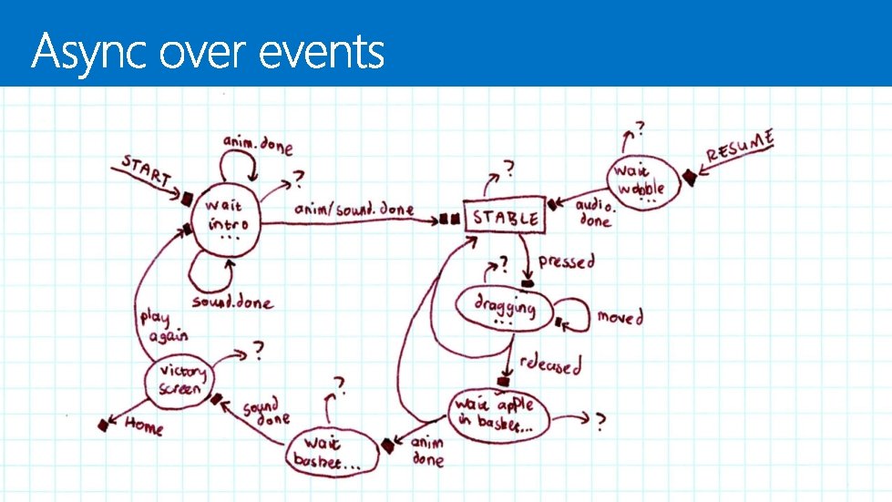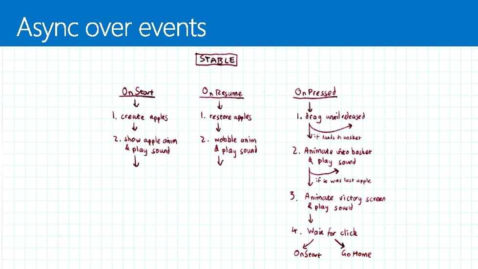 Protected Async Sub On. Pointer. Pressed(e As Pointer. Routed. Event. Args) ' Let user drag the apple Dim apple = CType(e. Original. Source, Image) Dim endpt = Await Drag. Async(apple) If Not Basket. Catchment. Area. Bounds. Contains(endpt) Then Return ' Animate and sound for apple to whoosh into basket Dim animate. Task = Apple. Storyboard. Play. Async() Dim sound. Task = Whoosh. Sound. Play. Async() Await Task. When. All(animate. Task, sound. Task) If Free. Apples. Count = 0 Then Return ' Show victory screen, and wait for user to click button Await Start. Victory. Screen. Async() Await btn. Play. Again. When. Clicked() On. Start() End Sub