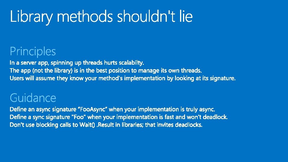 Sync methods: void Foo() { Foo. Async(). Wait(); } -- will deadlock!!!