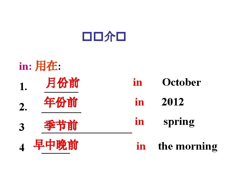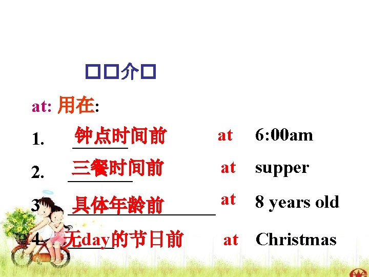 II. Fill in the blanks with ‘in’, ‘on’ or ‘at’. on Sunday. 1. We don’t go to school ______ 2. My birthday is _______ on April 1 st. 3. We’re going to see the doctor _______ at in the afternoon. four o’clock______ 4. They have a long holiday ______ in November. in 5. He was born ______ 1992. at 6. She starts to learn English _____6. in 7. It’s cold _______ winter in China. 8. They play the game ____ the on evening of 31 st October.