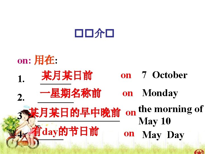 在有day节日前用 on 1. New Year’s Day 2. Children’s Day 3. May Day 4. Mother’s Day 5. Father’s Day 6. Teachers’ Day 7. Thanksgiving Day 元旦节 儿童节 五一节 母亲节 父亲节 教师节 感恩节