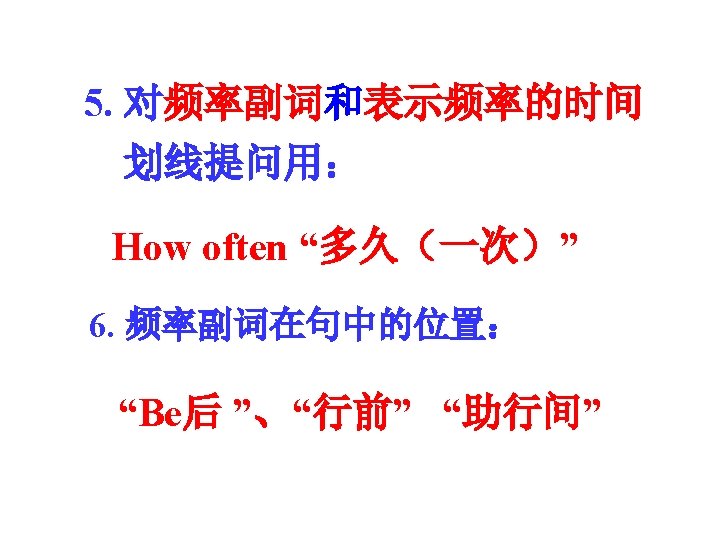Adverbs of frequency 频率副词 40% 20% 0% 60% 100% 80% 总是 always usually通常 often经常 sometimes 有时 seldom很少 never从不