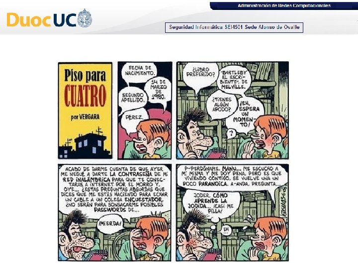 Ingeniería Social Estas técnicas o habilidades, incluyen generalmente un engaño o parcialización de la verdad con el objetivo de obtener la confianza de la persona con los conocimientos a obtener. Una vez que se ha obtenido la confianza de la persona, se procede a obtener la información considerada importante. La ingeniería social se da muchas veces vía telefónica, correo electrónico o a través de sesiones de chat, donde la verdadera personalidad del atacante queda oculta. Contramedidas: la educación de los usuarios de la red y la implementación de planes efectivos de concientización.