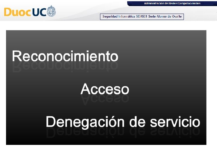 Efectos de un Ataque Interceptación: suele producirse cuando un usuario NO autorizado, obtiene acceso a información para la cual no posee acceso formal. El objetivo último de un ataque de interceptación, es el de ganar acceso a información para la cual el atacante no se encuentra autorizado. Sniffing o Eavesdropping. Modificación: Modificar el flujo de datos en una comunicación o editar el contenido de un archivo en un servidor. El objetivo último de todo ataque de modificación es realizar cambios sobre el entorno. Incluye eliminación, inserción o alteración de información. Man-in-the-middle, Manipulación de datos (Tampering) Interrupción: consiste en afectar, dañar o dejar sin funcionamiento un sistema completo o parte de éste. Para un atacante, puede ser un desafío, una venganza o la forma de facilitarle el acceso a algún otro recurso. Do. S, DDo. S. Falsificación: el objetivo es hacer creer a un sistema o dispositivo de la veracidad de los mismos, a fin de que este ejecute alguna acción que pueda ser aprovechada por el atacante, o simplemente a escenarios donde una persona participe de una conversación simulando ser otro. Spoofing.