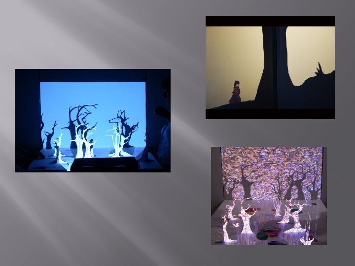 - Découvrir et analyser trois images du spectacle Discerner les éléments importants favorisant l’interprétation des trois photos : -le personnage « Akiko » de profil, en ombre chinoise, en action ; -l’environnement pictural d ’Akiko et ses caractéristiques (fond bleu, nuances, formes…) ; -les personnes qui mettent en oeuvre le spectacle.