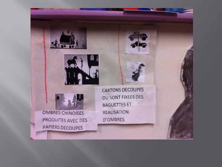 Chronologie des activités en amont du spectacle - Observation de diverses reproductions d’ombres chinoises - Langage, activités de communication et d’argumentation : Tri des reproductions par des critères mis en avant par les élèves (par binôme) au sein de petits ateliers - Comment produit-on ces ombres ? Proposer des critères de « fabrication » Faire recher les ombres obtenues à l’aide des mains , associer les ombres aux silhouettes (humaine ou animale), Isoler celles obtenues avec du papier découpé.